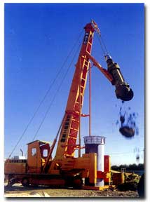 ベノト工法の掘削は、ケーシングチューブを掘削孔全長にわたり振動・押し込みながら、ケーシングチューブ内の土砂をハンマーグラブにて掘削・排土して行います。軟弱地盤で崩壊の激しい地質でも孔壁を保護しながら掘削ができ、近隣構造物への影響も少なくすみます。